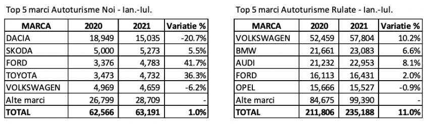 Pe ansamblul primelor 7 luni, autoturismele noi inregistreaza o crestere generala de 1,0%. Pe de alta parte, autoturismele rulate cu cele 235.188 unitati inmatriculate in perioda ianuarie – iulie 2021, inregistreaza o crestere de 11,0% comparativ cu perioada similara din 2020.