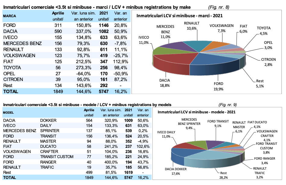 Top-ul pe mărci (autoturisme + autovehicule comerciale) după 4 luni din anul 2021 este condus de către Dacia (6.529 unități), urmată de Ford (3.376 unități), Toyota (2.594 unități), Volkswagen (2.488 unități), Skoda (2.461 unități), Hyundai (2.224 unități), Mercedes Benz (2.219 unități), Renault (2.033 unități), BMW (1.231 unități) și Peugeot (1.012 unități), potrivit APIA.